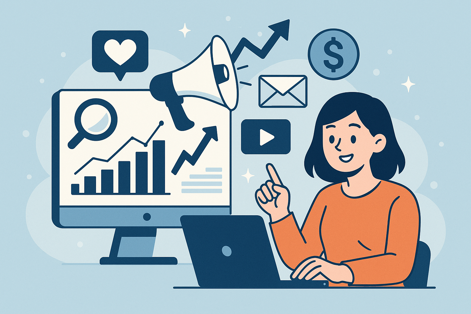소셜 미디어 마케팅, 검색 엔진 최적화(SEO), 콘텐츠 마케팅 등 다양한 방식이 포함되며,